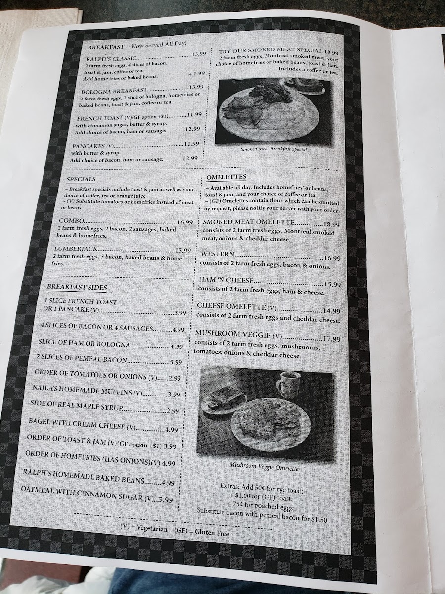 The menu at Ralph & Sons Diner features classic diner fare divided into several key categories, designed to accommodate breakfast, lunch, and casual dining needs. Visitors can find a variety of omelettes including options such as Smoked Meat Omelette, Western, Ham 'N Cheese, Cheese Omelette, and Mushroom Veggie. This section offers traditional breakfast choices that suit morning meals or lighter dining occasions.