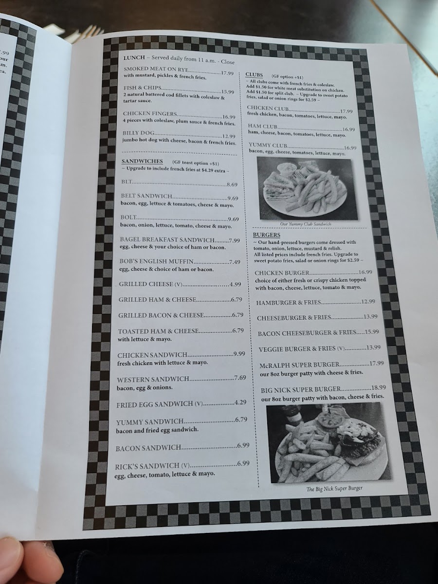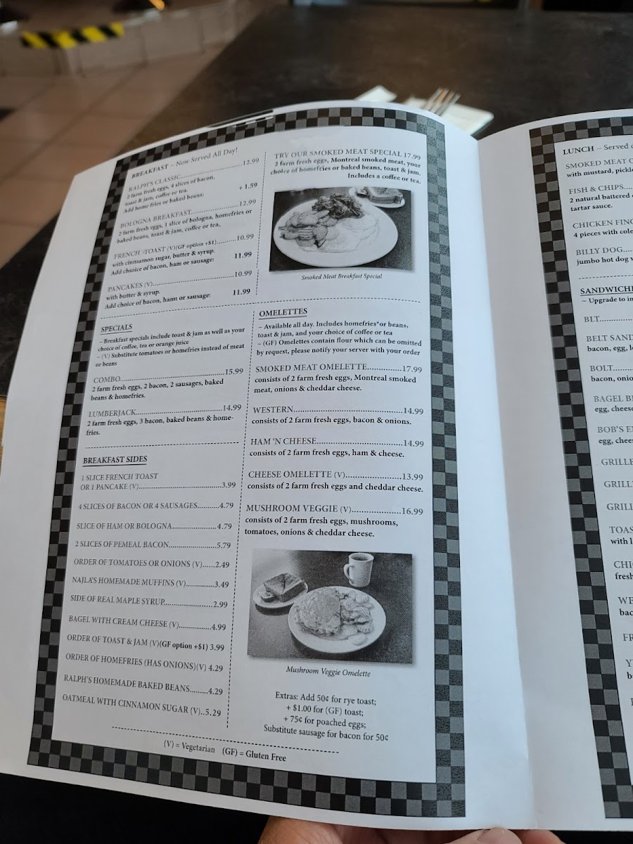 The lunch selection includes items like Smoked Meat on Rye, Fish & Chips, Chicken Fingers, and the Billy Dog, providing a range of hearty sandwich and main dish options appropriate for midday meals. These choices cater to those looking for familiar Canadian diner offerings during lunch hours.