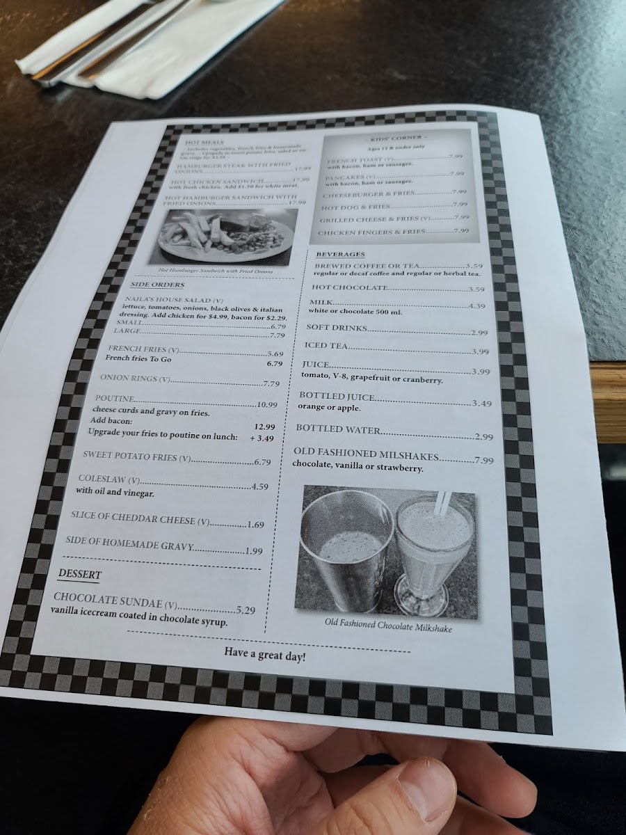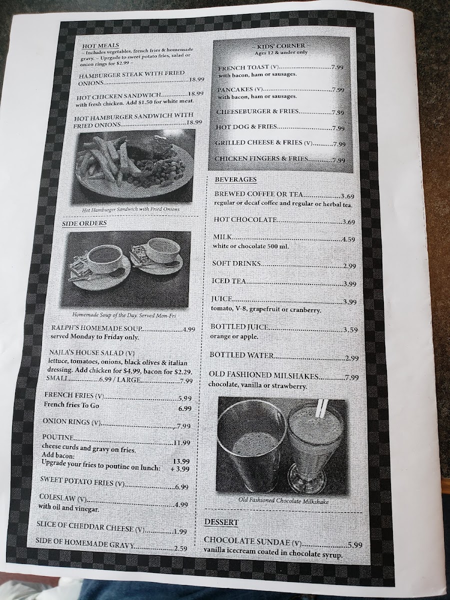Beverages are available to complement the food items, featuring brewed coffee or tea, hot chocolate, milk, soft drinks, iced tea, various juices, bottled water, and old-fashioned milkshakes. The beverage menu supports both breakfast and lunch dining, as well as casual refreshment breaks.